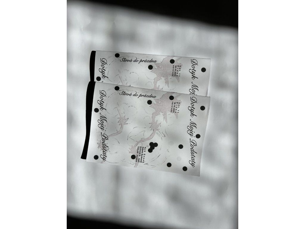 Dotyk mojej podstaty #1 je poeticko-vizuální zin, který zachycuje atmosféru vernisáže doplněné literárním programem. Publikace vznikla v rámci spolku Slová do prázdna a propojuje textové i vizuální přístupy několika autorů a autorek, čímž vytváří vrstevnatou, intimní reportážní výpověď o setkání umění a osobní zkušenosti.