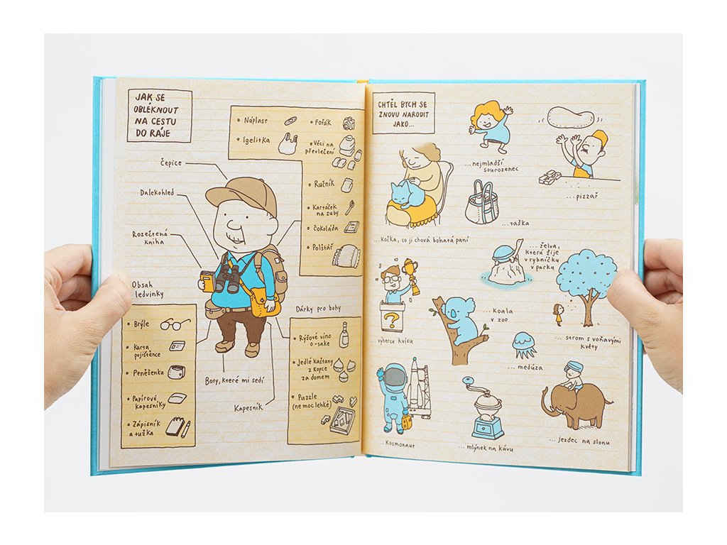 Co bude, až umřeme? Tuhle otázku si jednou položí každý. Dědeček hrdiny našeho příběhu umřel a nechal po sobě deník. Je v něm popsáno, jak si představuje svět, do kterého se dostane po smrti... Je nějaký ráj? A jak vypadá peklo? Bude se tam o něj někdo starat? Potká nějakého boha? A co by měli udělat jeho příbuzní, až umře? A protože je hrdina Šinsukeho knih, stejně jako jeho děda, neobvykle zvědavý, deník v něm vyvolá spoustu otázek. Možná že když o nich bude důkladně přemýšlet, nebude mu tak smutno... Knížka, která velké téma otevírá s lehkostí a samozřejmostí: smrti totiž není potřeba se bát, ale měli bychom o ní s dětmi mluvit a přemýšlet. Vždyť je součástí každého života