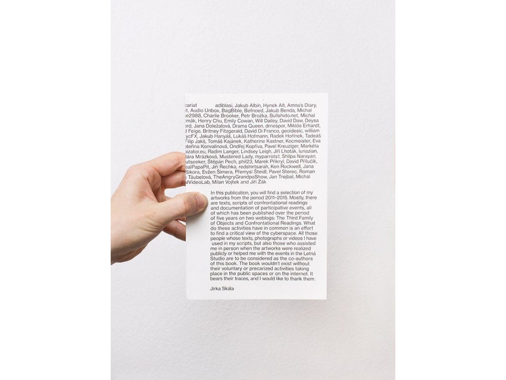 Publikace Litanie prekariátu představuje výběr uměleckých aktivit Jirky Skály z let 2011 až 2015. Jedná se převážně o dokumentace participativních akcí, které po dobu pěti let realizoval v rámci dvou internetových blogů: Třetí skupina předmětů a Konfrontační čtení. Tyto aktivity spojovala snaha o nalezení kritické percepce výrobních vztahů v rámci znalostních ekonomik. Jirka Skála doplnil publikaci o dva eseje, v nichž se pokusil o shrnutí tohoto období a o definování možných emancipačních strategií, které by umožnily uživatelům digitálních technologií a infrastruktury vymanit se z jejich vysoce prekarizované životní situace.