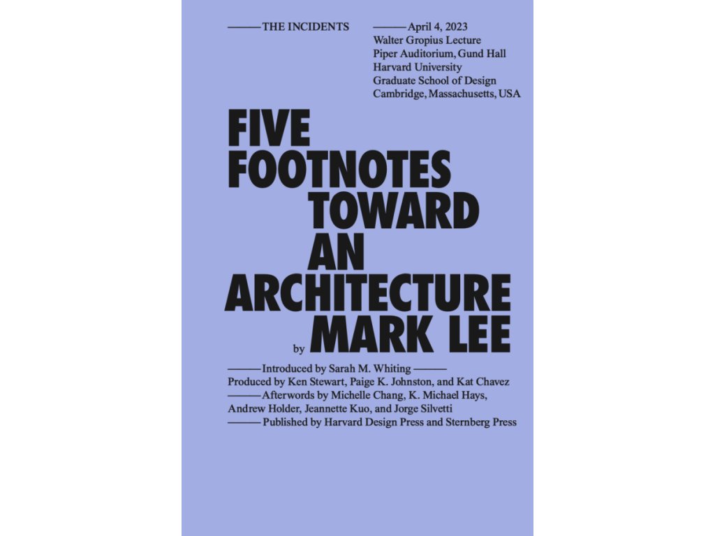 On the occasion of his fifth and final year as Chair of the Department of Architecture at the Harvard University Graduate School of Design, architect and educator Mark Lee strings together five “footnotes”—on history, on cadence, on autonomy, on America, and on point—to assess the relationship between architectural education, research, and professional practice. Evoking a similar position that marked his tenure, Lee delivers a lecture that embraces dialogue, context, and precedent, and rejects the notion of a heroic manifesto in favor of the footnote: “something ancillary, something used for referencing and providing citations for metanarratives that already exist.” And why five? “It’s a ubiquitous number in the culture of architecture. Five orders, five architects, five points.”