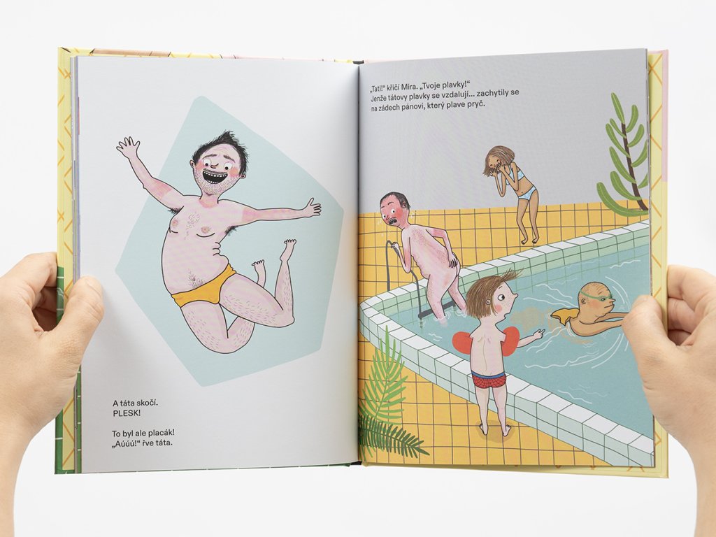 „Koukej na mě!“ křičí ze skokanského můstku Miřin tatínek. Skákání je přece legrace! To ano, zvlášť když při tom taťkovi spadnou plavky. Mira musí tatínka zachránit, a tak se pro ně vrhne. Záchrana tatínka: splněno! Skok do bazénu: taky splněno!
